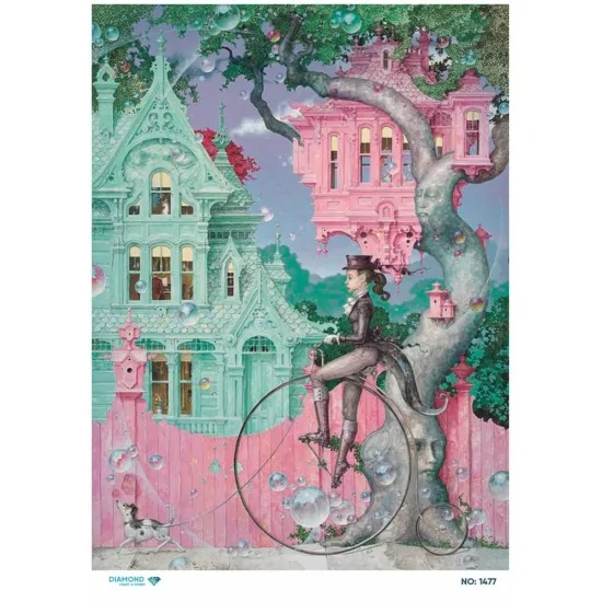 Görsel, fantastik ve biraz da nostaljik bir temaya sahip. Arka planda pastel renklerle boyanmış, detaylı mimari süslemelere sahip evler görülüyor. Önde, bir ağaç gövdesi ve üzerinde eski tip yüksek tekerlekli bisiklet kullanan bir figür bulunmakta. Figür, şapka ve eski moda giysiler giymiş. Ortam, köpükler ve pastel tonlar ile süslenmiş, peri masalı benzeri bir atmosfer hakim. Altta ayrıca küçük bir köpek görülüyor. Bu sahneler, bir hayal dünyası ya da masalsı bir ortamı ifade ediyor.
