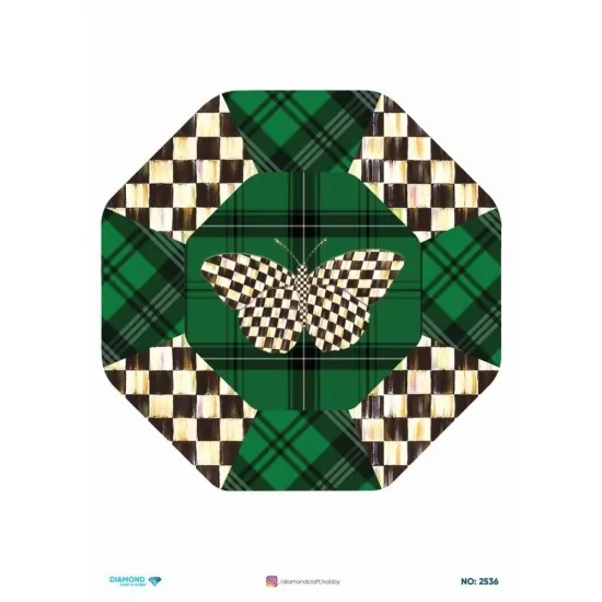 Görselde geometrik bir desen ve ortasında bir kelebek figürü bulunuyor. Desen, kareli ve ekoseli yeşil tonlarıyla, satranç tahtası benzeri siyah-beyaz karelerden oluşuyor. Kelebek figürü, taşıdığı geometrik ve kontrast detaylarla dikkat çekiyor. Tasarım dekoratif bir stile sahip ve nostaljik unsurlar içeriyor.