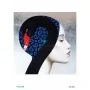 Görselde, bir kadın profili ve siyah bir kuğu figürü bir arada, iç içe geçirilmiş şekilde yer almakta. Kadının yüzü detaylı bir şekilde işlenmiş ve arka plandaki kuğunun boynu ve başı, kadının kafasına bir şapka gibi oturuyor. Kuğunun tüyleri üzerinde mavi ve siyah desenler dikkat çekiyor. Görselin genel temasında estetik bir zarafet ve stilize bir tasarım öne çıkıyor. Kontrast renk kullanımı, görselin dikkat çekici ve anlamlı bir kompozisyon oluşturmasını sağlıyor.