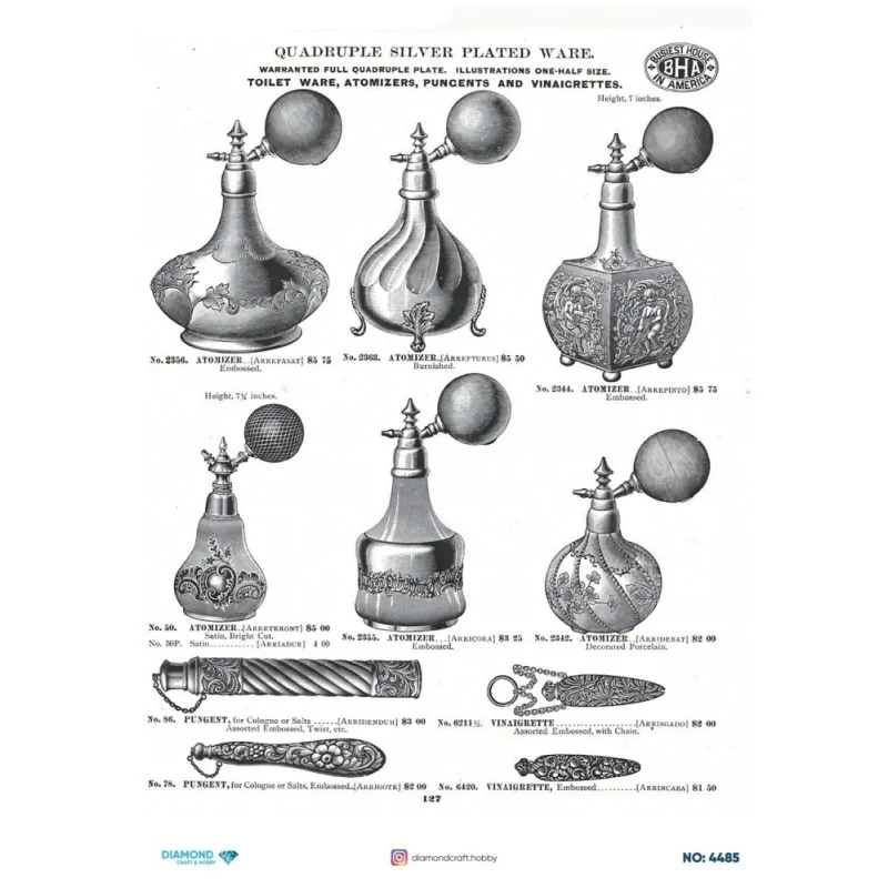 Görselde çeşitli gümüş kaplamalı eşyaların çizimleri yer almakta. Bu eşyalar arasında pompalı parfüm şişeleri (atomizer), koku tüpleri (pungent) ve küçük parfüm kutuları (vinaigrette) bulunmakta. Tasarımlar genellikle kabartmalı ve dekore edilmiş, bazıları çiçek motifleri içeriyor. Görselde fiyatlar ve ürün numaraları da belirtilmiş. Stili nostaljik ve dekoratif bir havası var, muhtemelen antika veya vintage bir katalogdan alınmış.