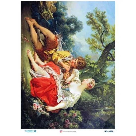 Görselde doğa içinde, romantik bir sahnenin tasvir edildiği bir resim bulunuyor. İki figür yere uzanmış, bir adam elinde müzik aleti tutarken bir kadın ona bakıyor. Ortam, yeşillikler ve ağaçlarla çevrili, çiçeklerle süslenmiş. Renkler canlı ve sahne pastoral bir tema taşıyor. Bu tür bir resim genellikle dekoratif amaçlarla kullanılır ve 18. yüzyıl Rokoko sanatını anımsatır.