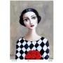 Görselde, elinde kırmızı güller tutan ve siyah beyaz pötikare deseni giymiş melankolik bir kadın figürü resmedilmiştir. Figürün saçları kısa ve dalgalıdır, yüz hatları ise belirgindir. Arka plan sade ve nötr bir renkte, bu da figürü öne çıkarmaktadır. Stil olarak dekoratif ve nostaljik bir hava taşır.