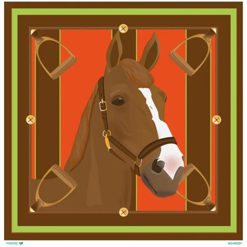 Görselde merkezi bir at figürü bulunmaktadır. Etrafı, dört köşesine yerleştirilmiş üzengi motifleriyle dekore edilmiştir. Arka planında turuncu ve kahverengi tonları hakimdir. Tasarım, hayvansal ve binicilik temalarına odaklanmıştır. Bu desen, stil olarak dekoratif ve doğasal bir hava taşımaktadır.