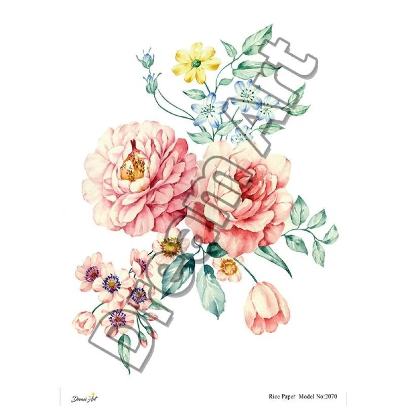 Görselde, çeşitli çiçeklerin yer aldığı renkli bir çiçek deseni bulunmakta. Bu çiçekler, pembe, sarı ve mavi gibi pastel tonlarda resmedilmiş. Görsel genel olarak dekoratif bir tarza sahip ve estetik bir görünüm sunuyor. Arka plan beyaz, bu da çiçeklerin öne çıkmasını sağlıyor. Görsel üzerinde "Dream Art" yazısı ve "Rice Paper Model No:2070" metni yer alıyor, bu da ürünün bir tasarım kağıdı veya dekupaj kağıdı olabileceğini gösteriyor.
