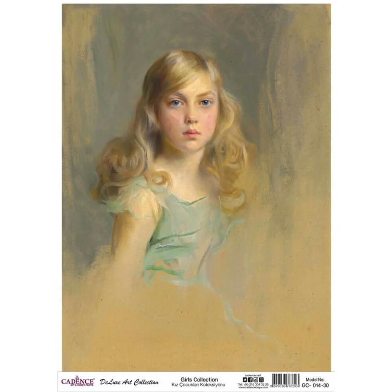 Görselde, doğal bir tarzda resmedilmiş genç bir kızın portresi bulunuyor. Kızın yüzü ve saçları detaylı ve gerçekçi bir şekilde çizilmiş, fonda ise sade bir renk kullanımı mevcut. Genel olarak pastel tonlar hakim. Resmin alt kısmındaki yazılarda, bu portre "Girls Collection" (Kız Çocukları Koleksiyonu) adı altında sunulmuş. Portre, nostaljik ve dekoratif bir hava taşıyor.