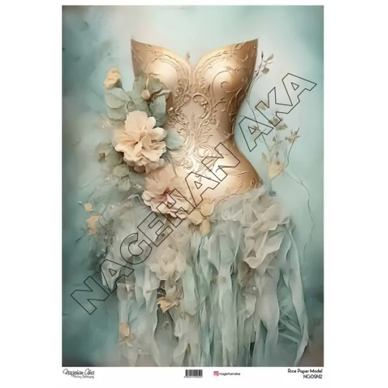 Görselde, altın rengi bir korse figürü, sol tarafında açık renk çiçeklerle süslenmiş olarak yer almakta. Korse etrafında ve altında akıcı, tül benzeri detaylar mevcut. Arka plan, yumuşak mavi tonlarındadır ve genel görünüm oldukça zarif ve dekoratif bir stil yansıtmaktadır. Görüntü, sanatsal bir dokunuşla üç boyutlu bir görünüm izlenimi vermektedir.